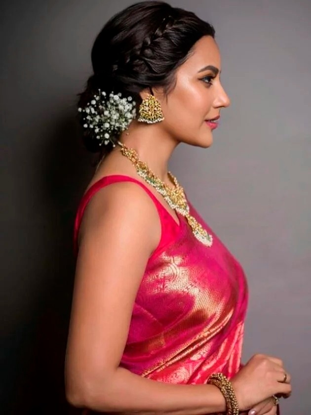 भारी साड़ी हो तो बन या ब्रेडेड बन अच्छा लगता है, हल्की साड़ी हो तो ओपन हेयर या ब्रेड।
