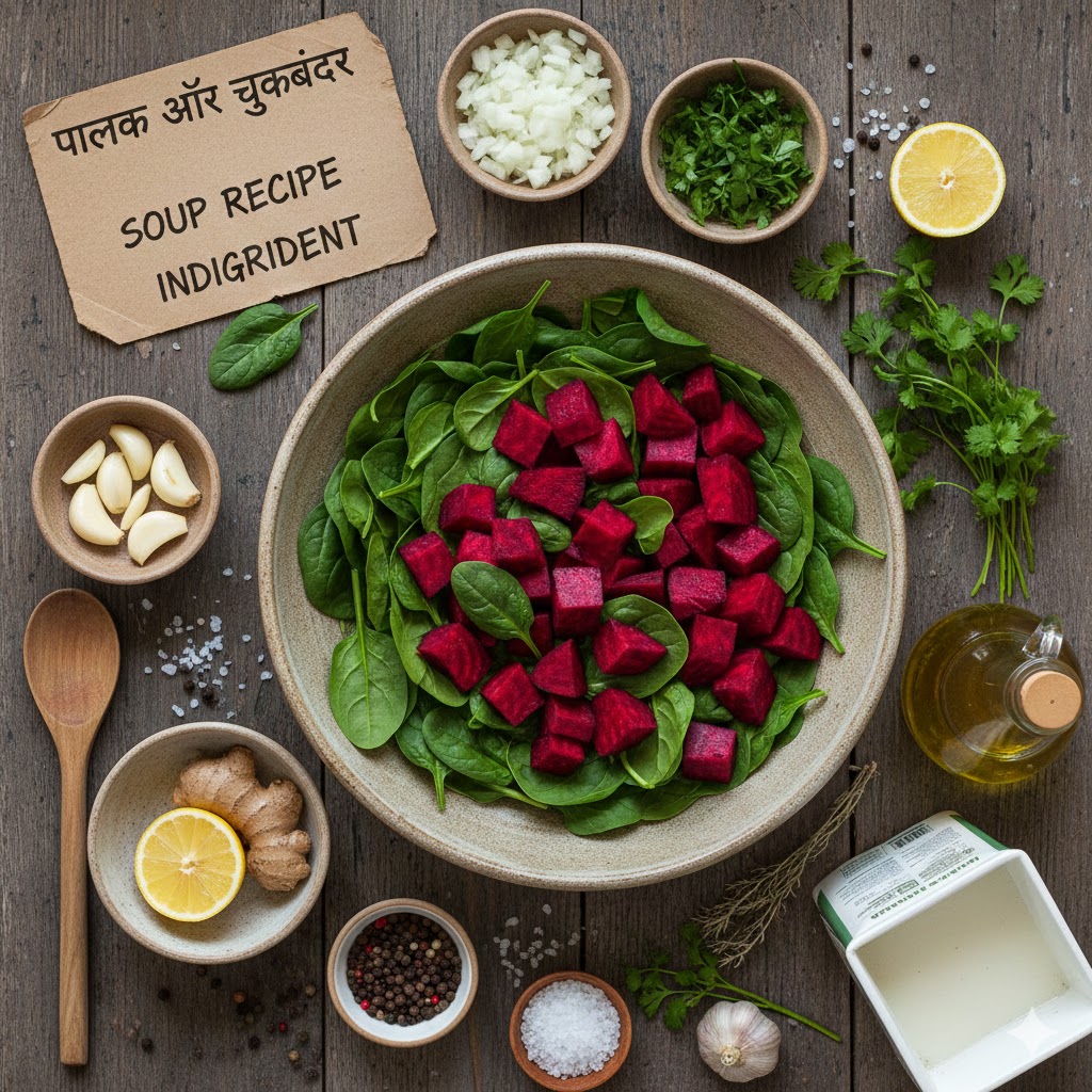 सबसे पहले एक पैन में तेल या घी गरम करें। इसमें लहसुन, अदरक और प्याज़ डालकर हल्का सुनहरा होने तक भूनें। अब कटे हुए चुकंदर डालें और 2–3 मिनट तक पकाएँ। इसके बाद पालक डालकर हल्का सा चलाएँ। अब इसमें पानी या वेजिटेबल स्टॉक डालें और ढककर 10–12 मिनट तक उबालें, जब तक सब्ज़ियाँ नरम न हो जाएँ।